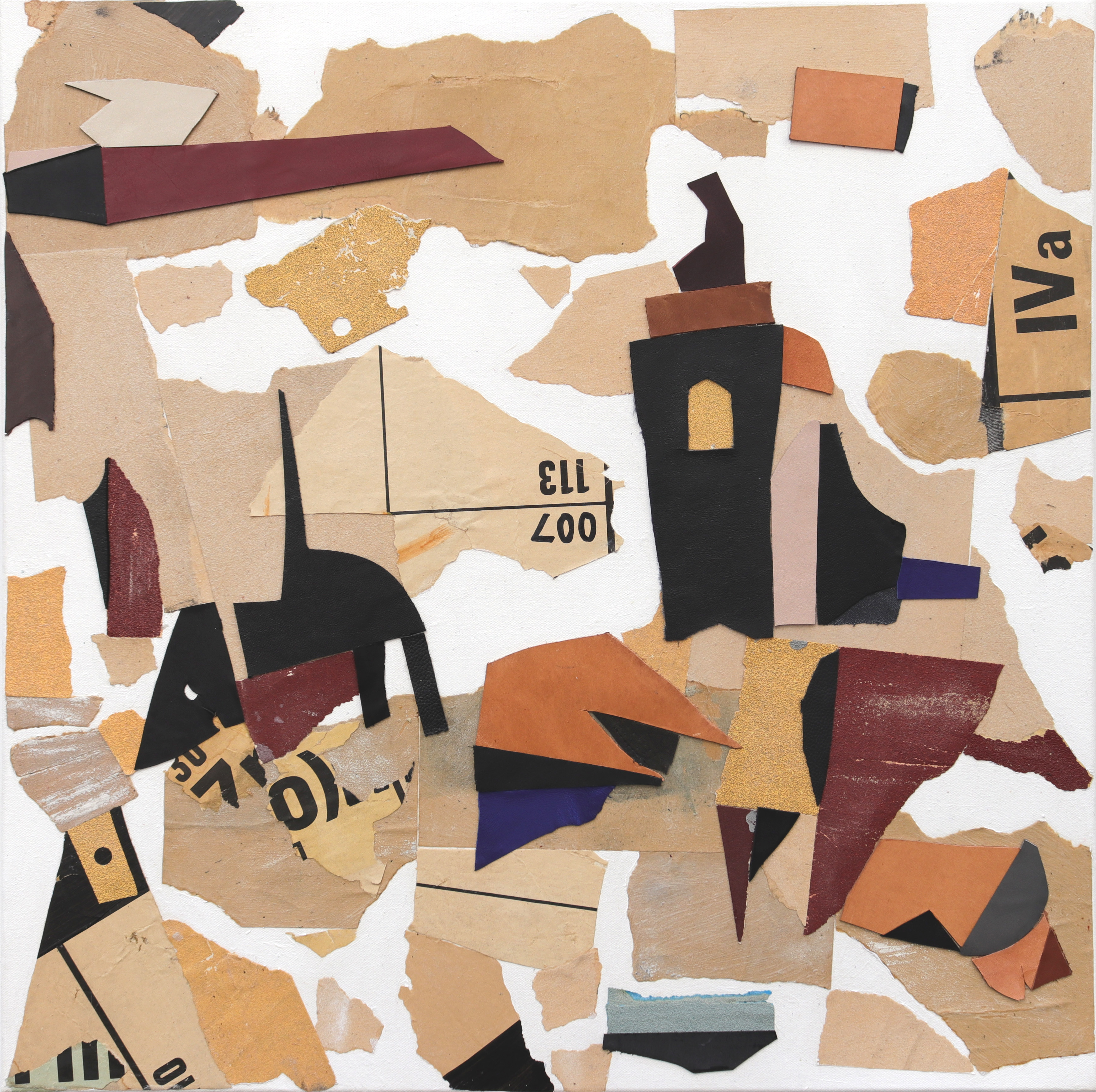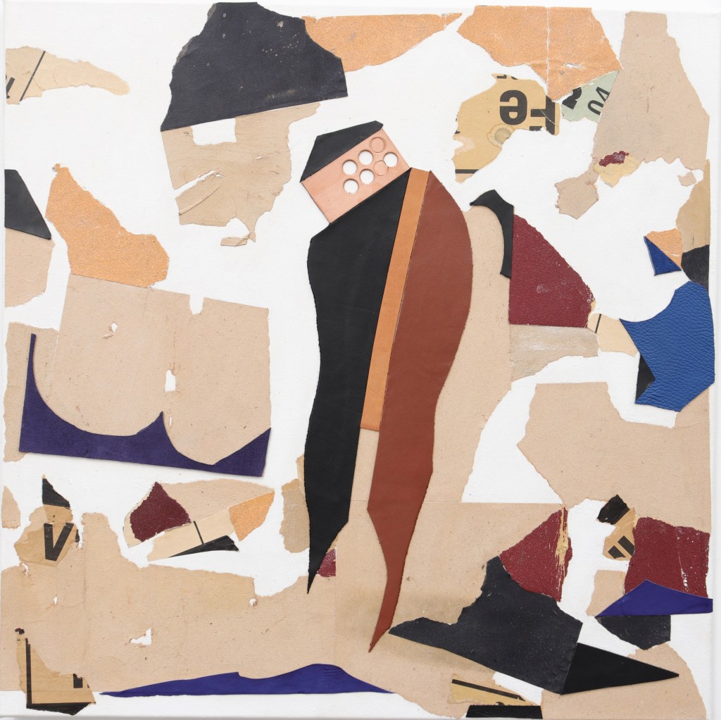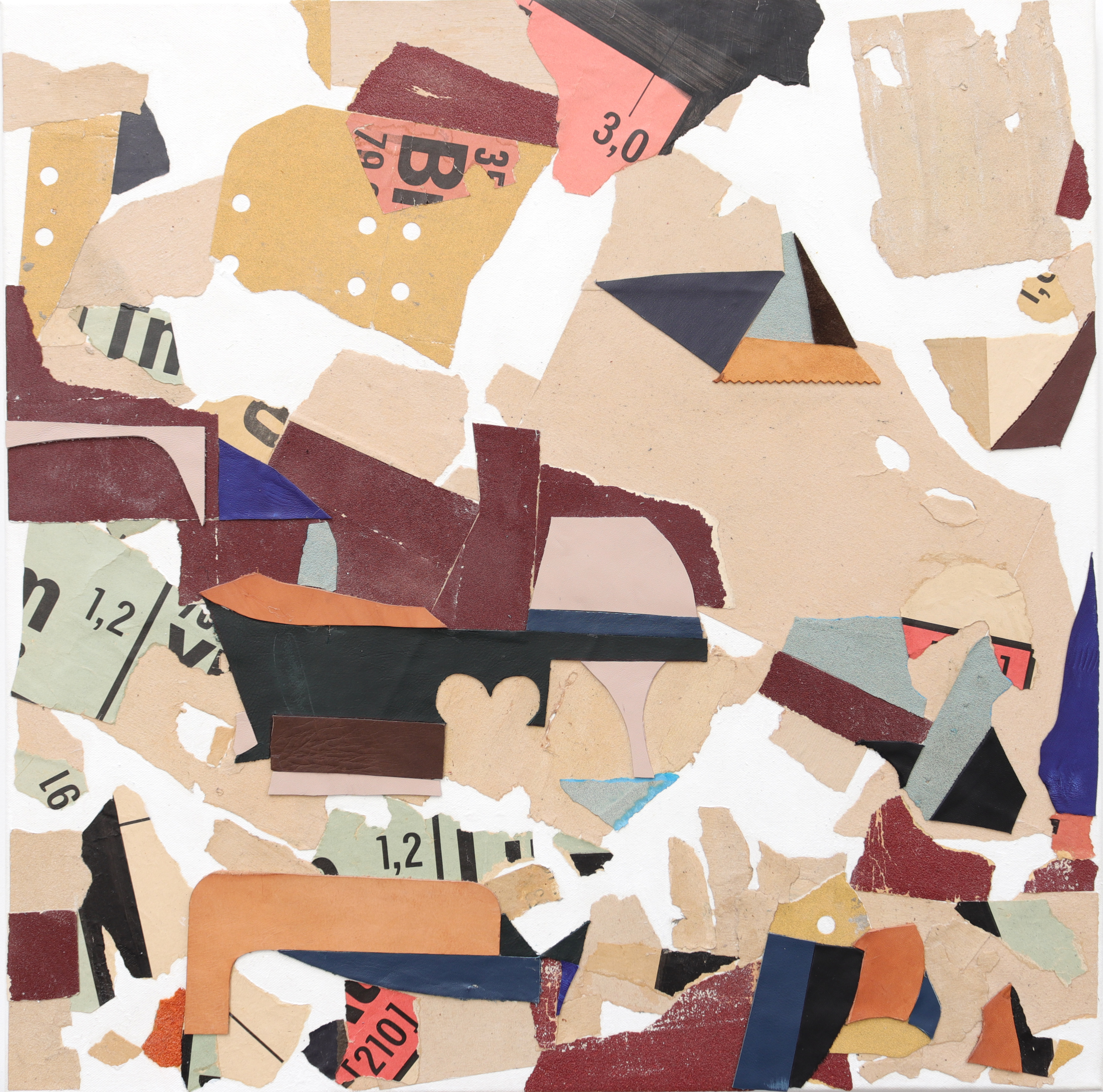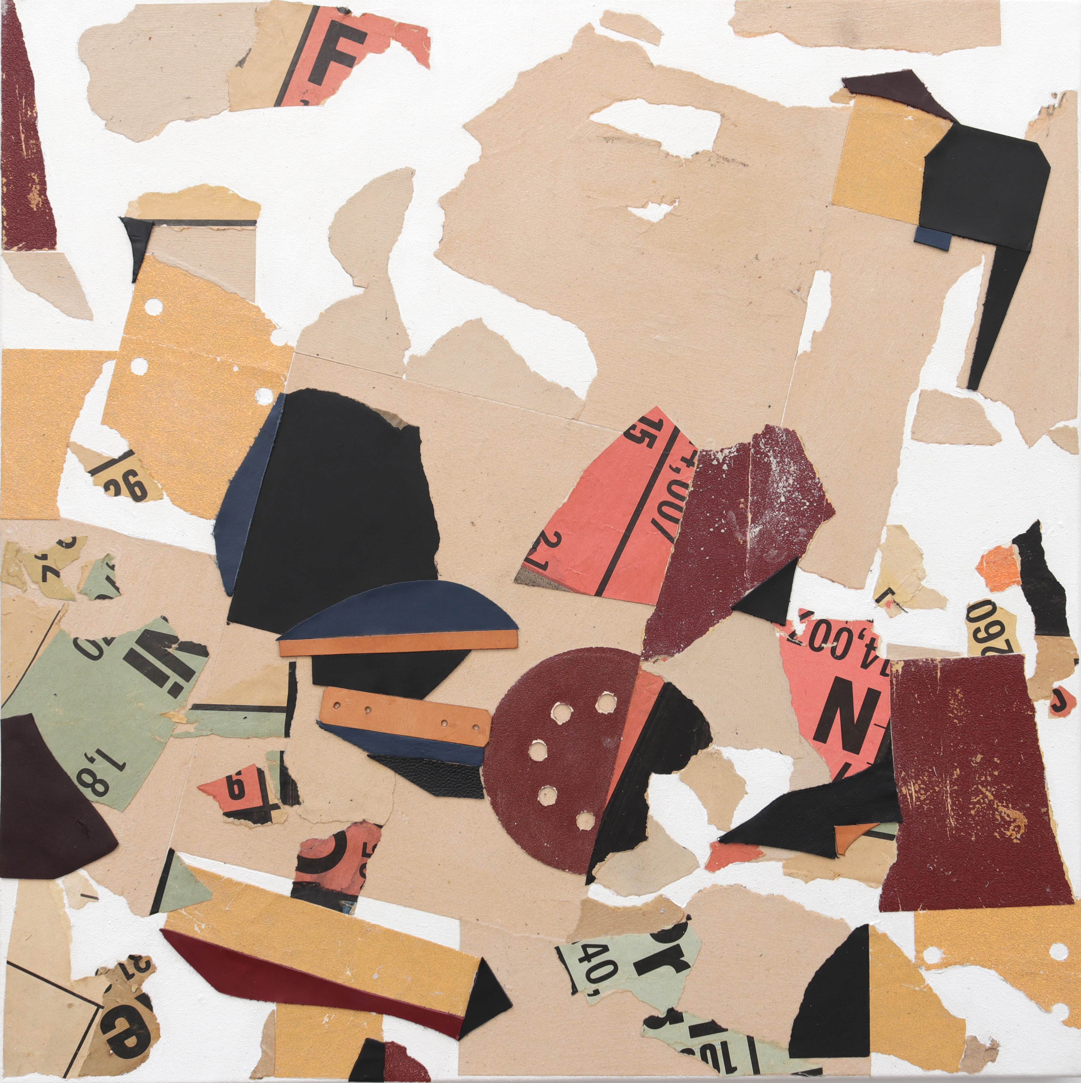 „B 210“, 2022, sandpaper, leather, fragments of periodic table, acrylic on canvas, 60 x 60 cm