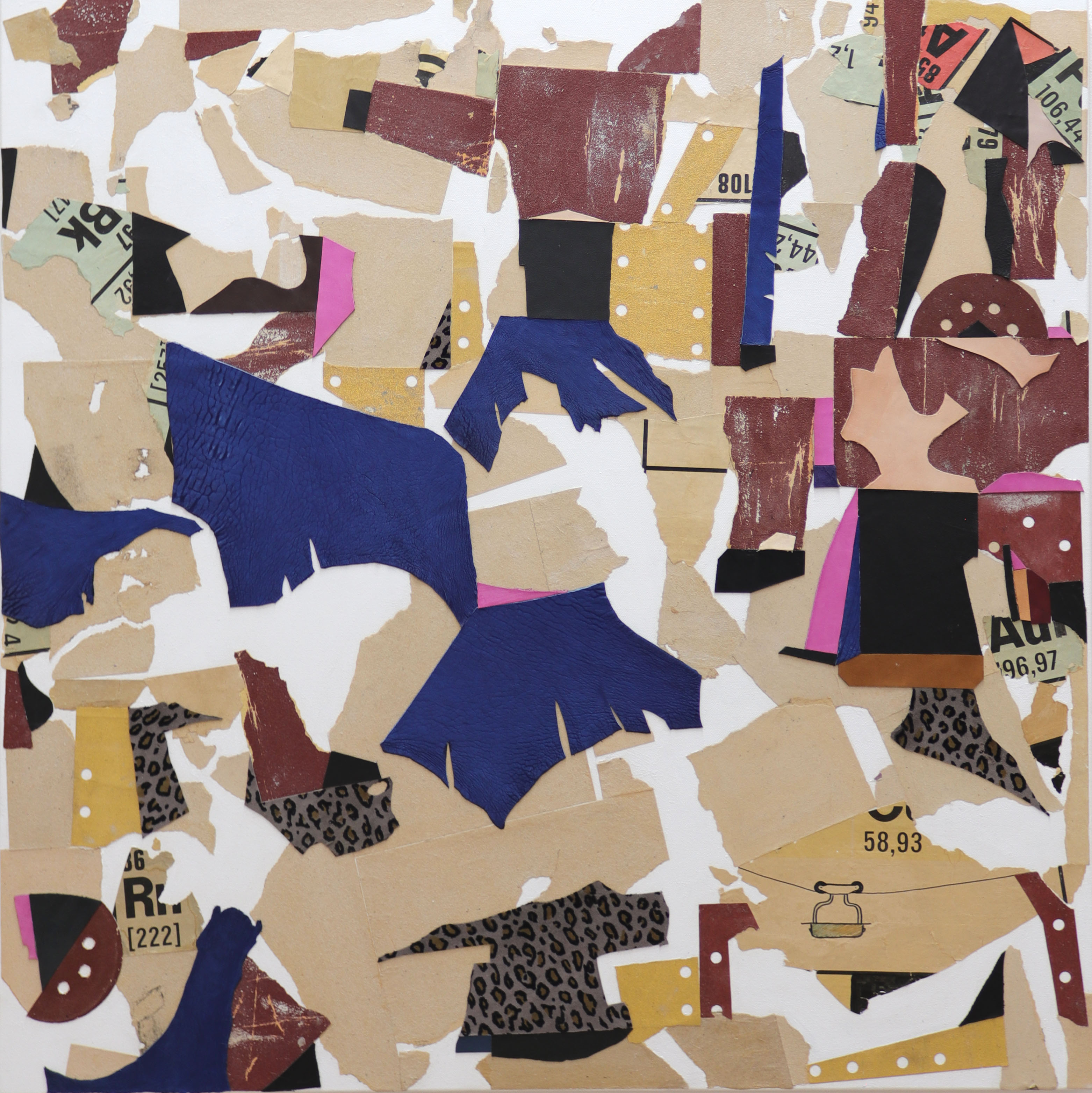 „Jagu Blue“, 2022, sandpaper, leather, fragments of periodic table, acrylic on canvas, 100 x 100 cm