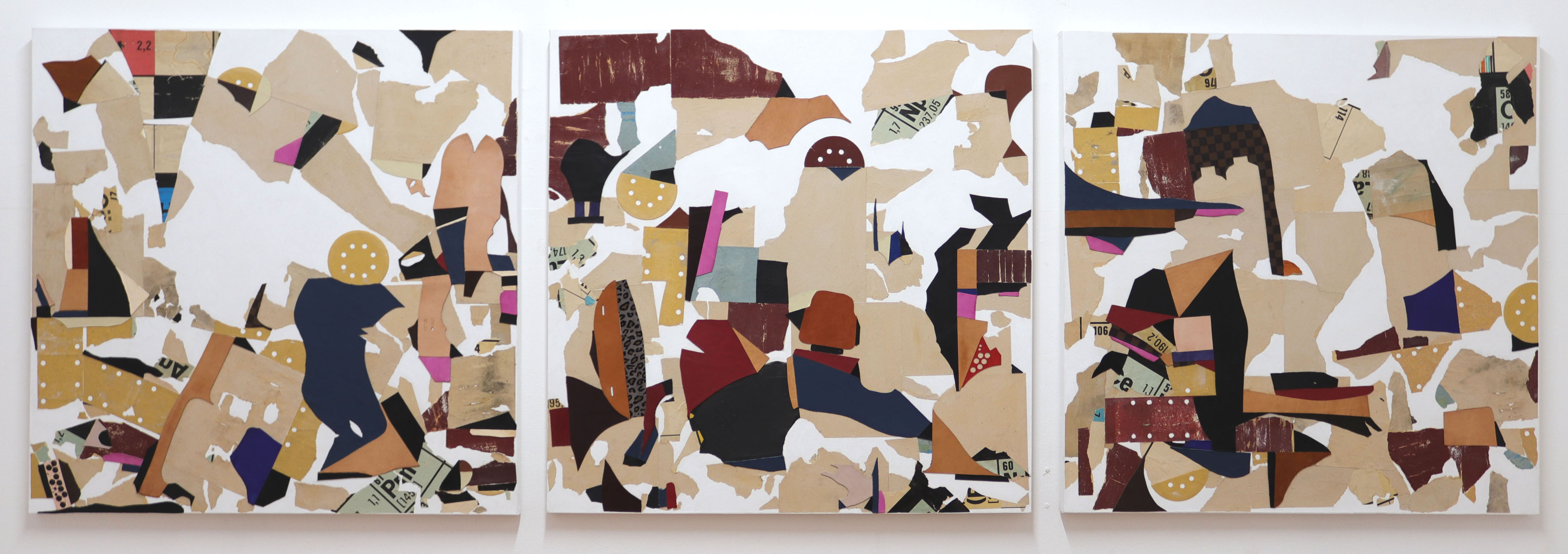 „L-ement“, tryptich, 2022, sandpaper, leather, fragments of periodic table, acrylic on canvas, 100 x 300 cm